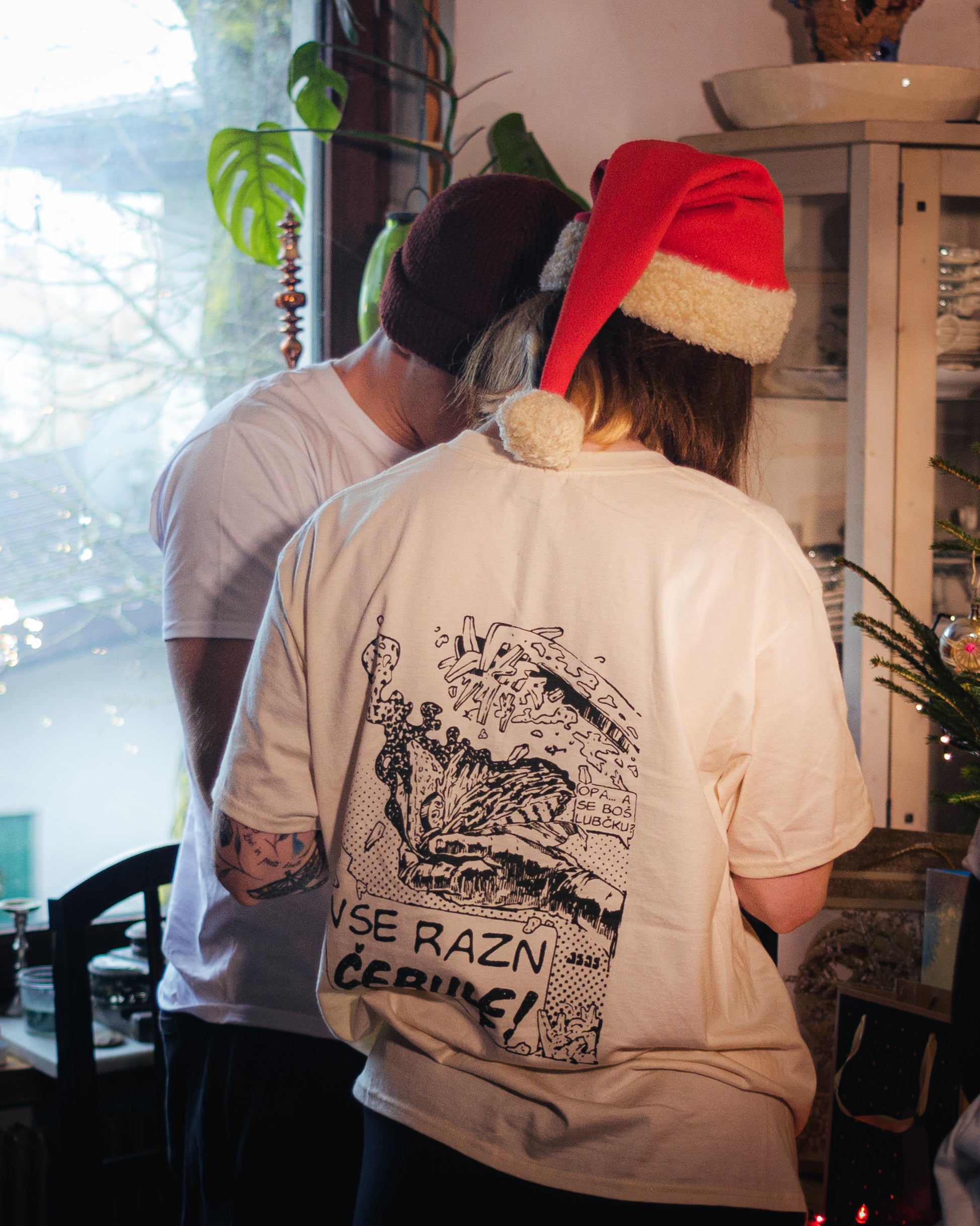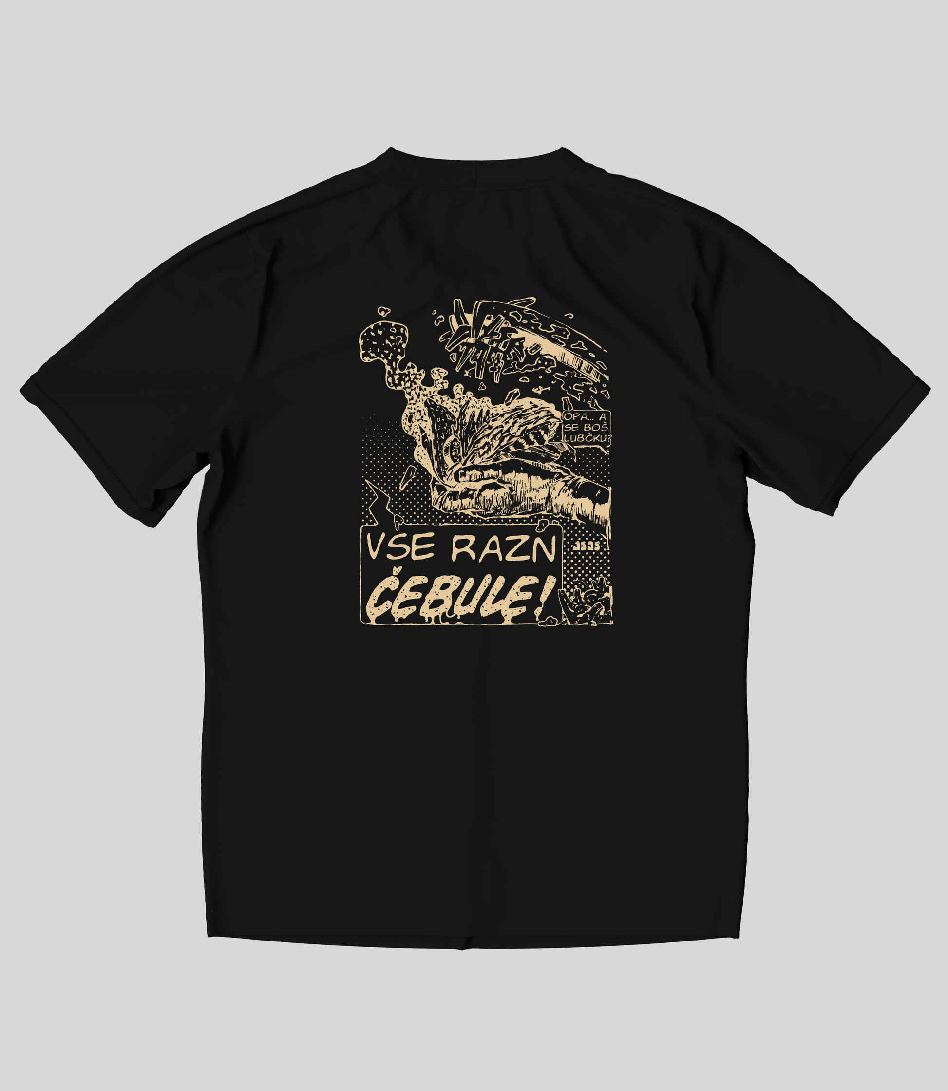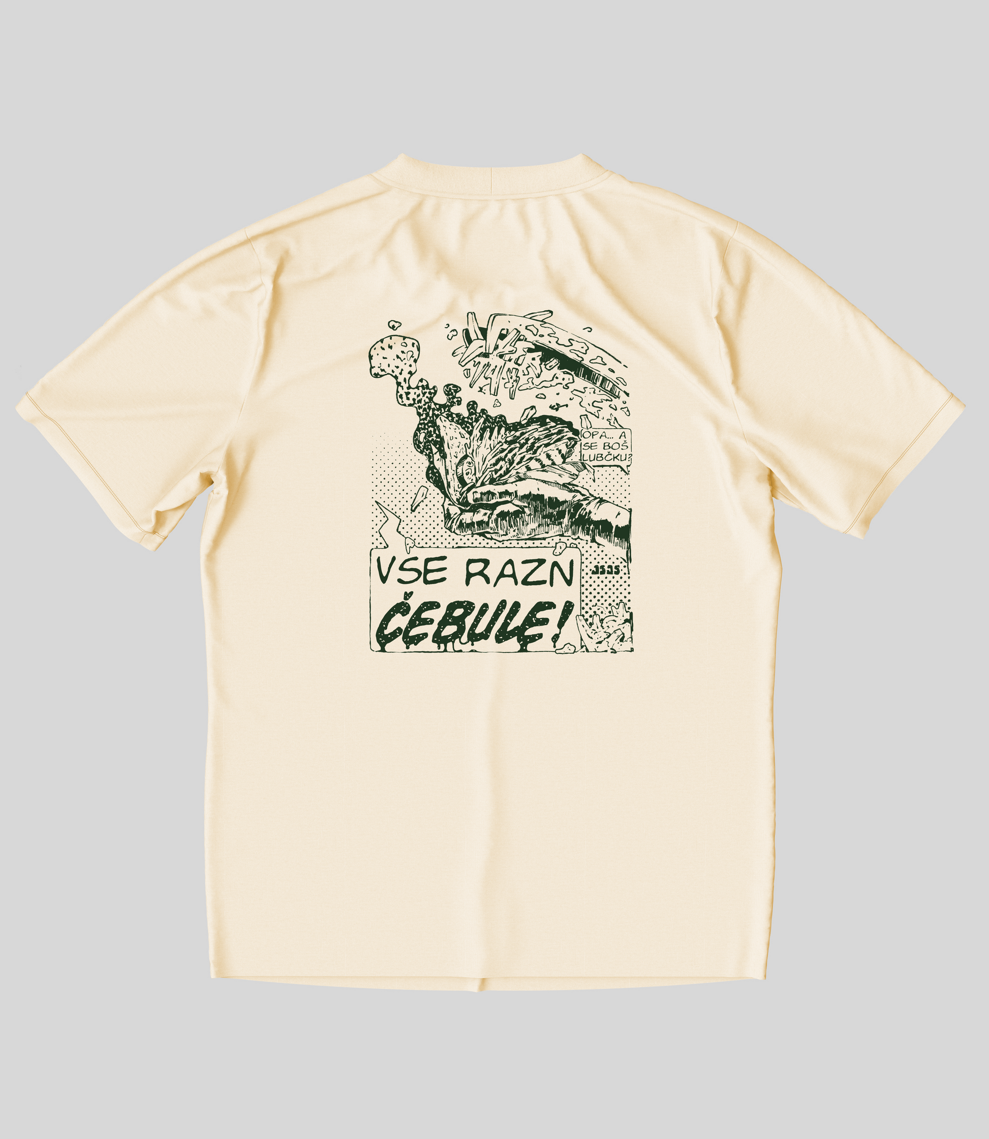 Majica je na voljo v bež barvi z temnozelenim tiskom ali v črni barvi z bež tiskom. Majica je iz 100 % bombaža, potiskana s sitotiskom.
