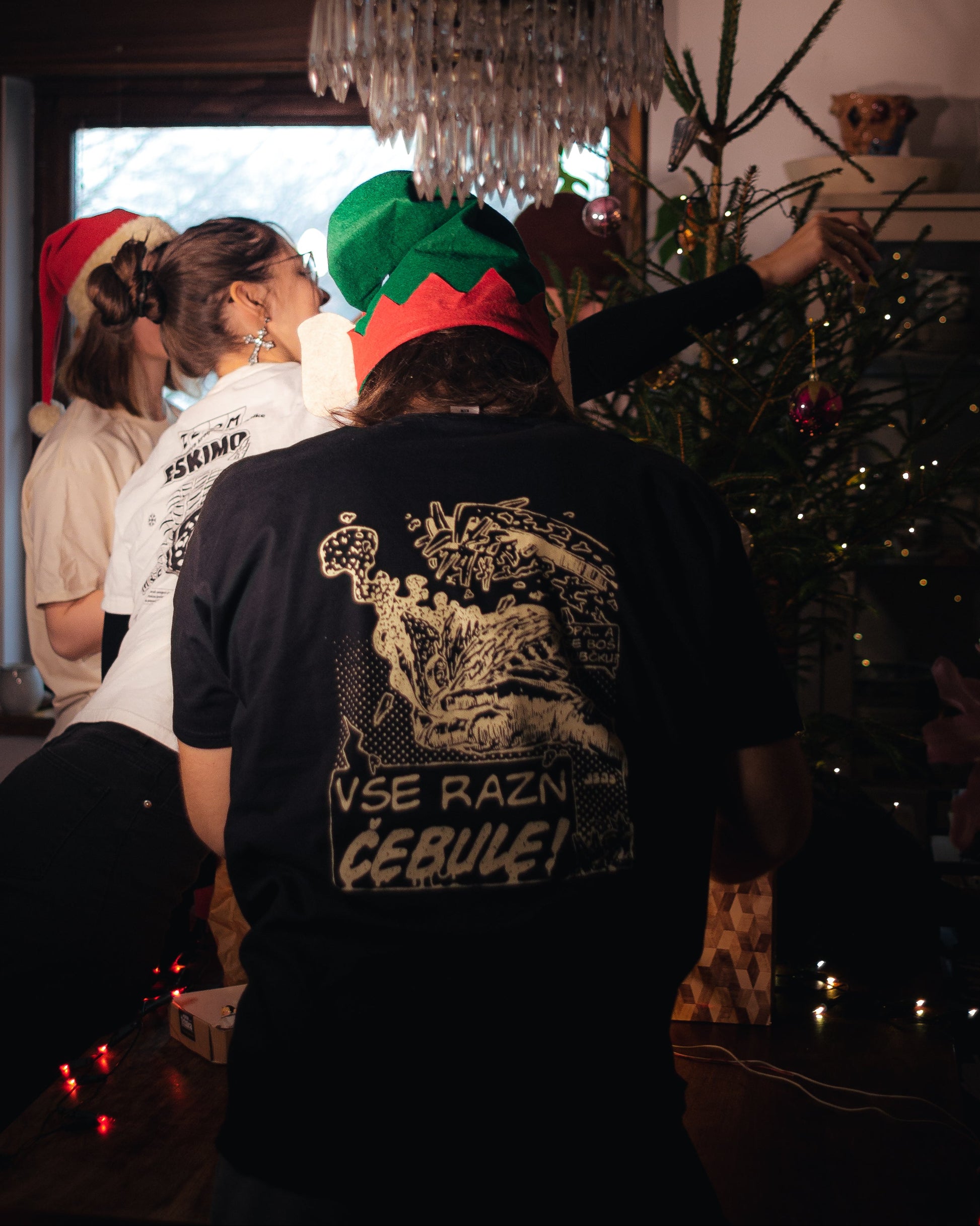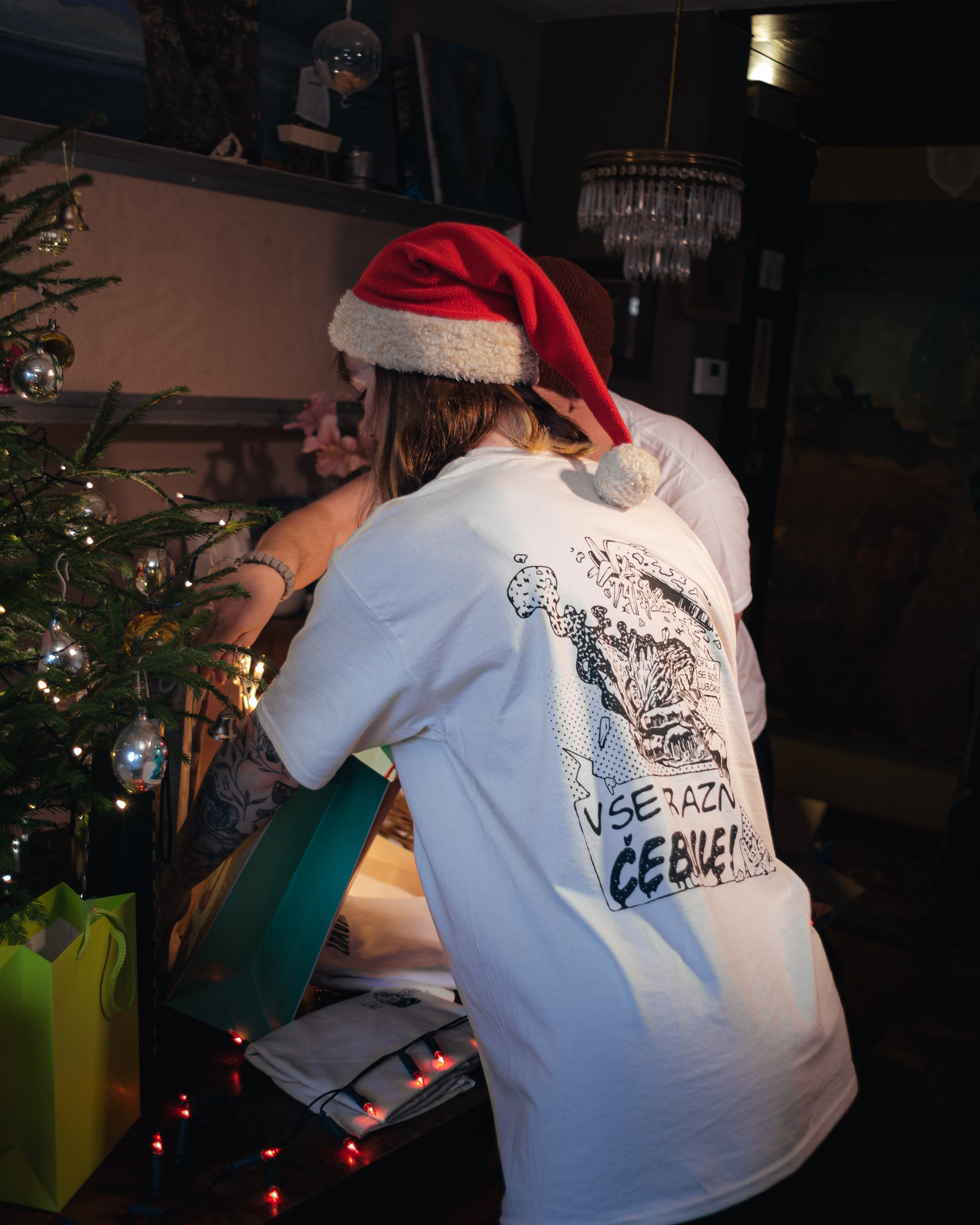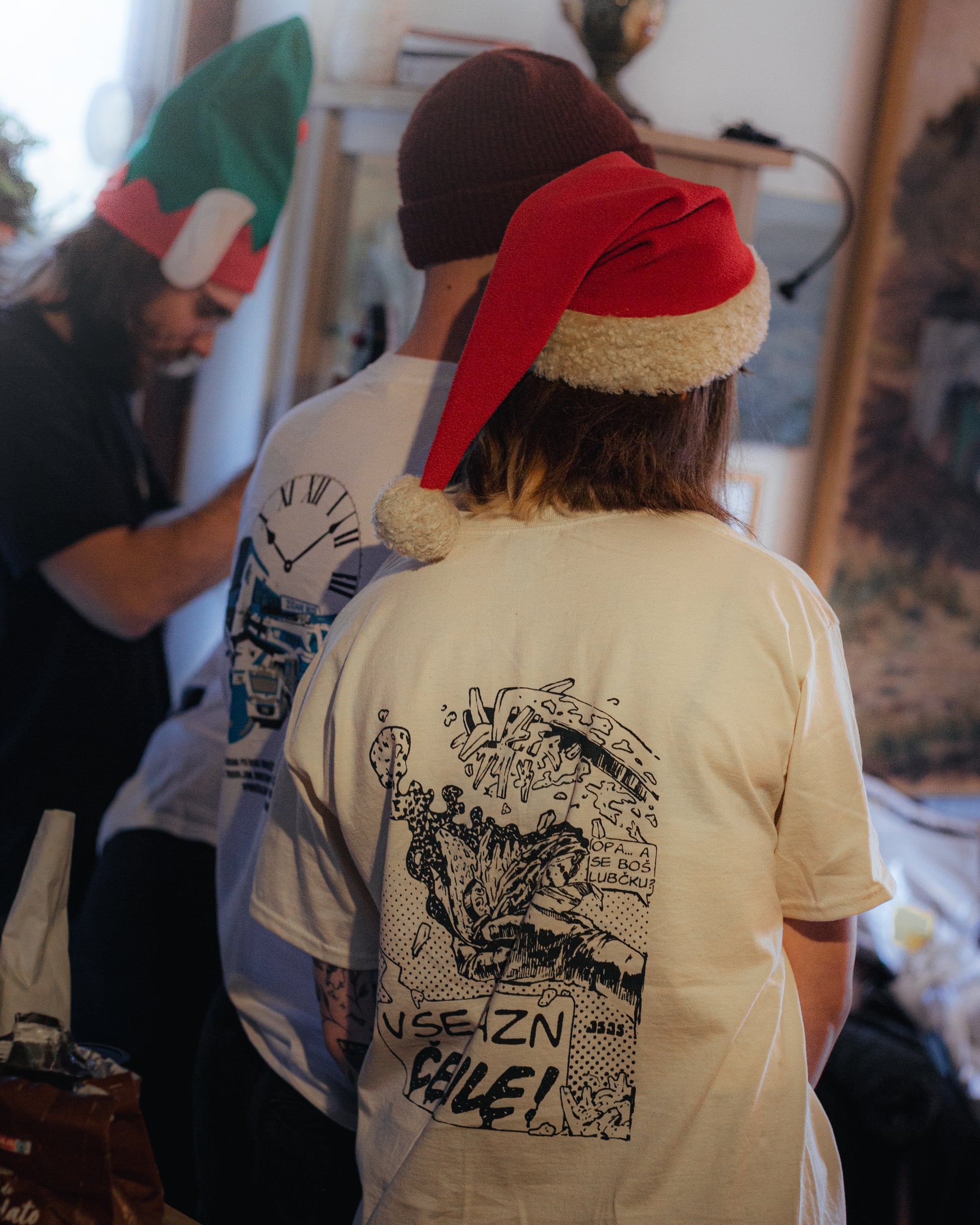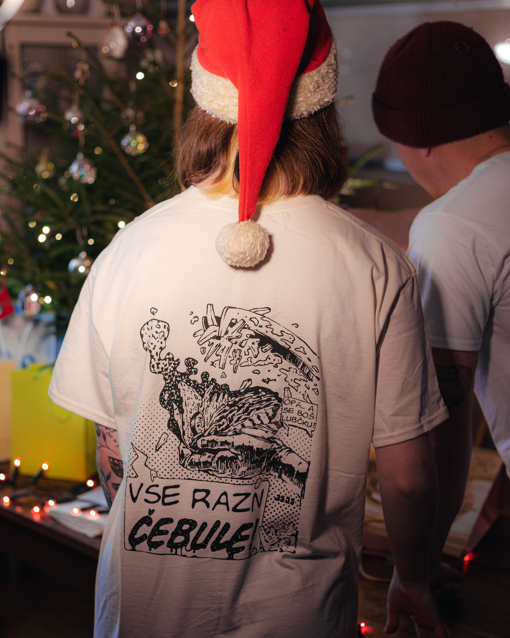 Majica je na voljo v bež barvi z temnozelenim tiskom ali v črni barvi z bež tiskom. Majica je iz 100 % bombaža, potiskana s sitotiskom.